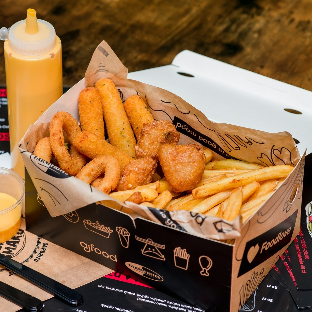 Do wyboru: stripsy lub nuggetsy (kurczak), frytki / soczek