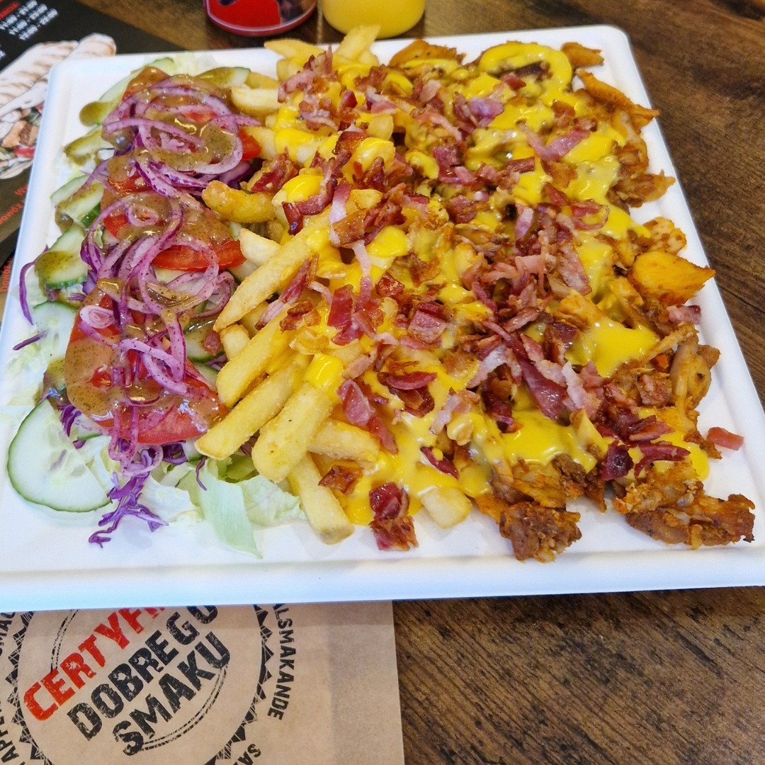 mięso/ frytki/ kapusta pekińska/ kapusta czerwona/ ogórek piklowy/ pomidor/ czerwona cebula/ sos vinegret/ bekon/ sos serowy/ prażona cebulka/ sos -